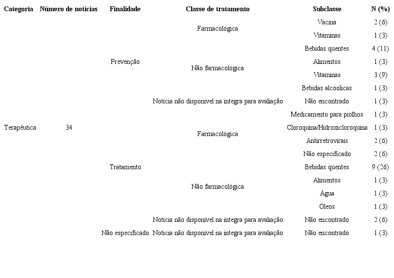 São notórios a relevância e o grande número de veiculações midiáticas acerca do tema, fazendo com que a temática da terapêutica perpasse por dois tópicos principais. O primeiro e mais eminente é observado devido a elevada porcentagem de notícias que envolvem bebidas quentes (37%), como chás medicinais. O conhecimento tradicional popular, que se utiliza destes recursos para alívios de sintomas de resfriados e gripes convencionais, tem se expandido ao novo vírus. Entretanto, nenhuma comprovação deste recurso terapêutico foi demonstrada, pois como é informado pelo MS: “Até o momento, não há nenhum medicamento, substância, vitamina, alimento específico ou vacina que possa prevenir a infecção pelo coronavírus (COVID-19)” 23.