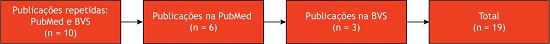 Comparando-se os resultados obtidos na PudMed e na BVS, identificou-se que dez publicações compareciam em ambas, seis apenas na PubMed e três apenas da BVS, totalizando 19 publicações, consoante a Figura.