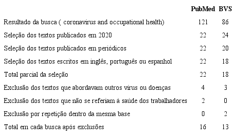 A busca de artigos foi realizada entre março e abril de 2020, nas seguintes bases de dados: National Library of Medicine (PubMed) e Biblioteca Virtual da Saúde (BVS). Tanto na PubMed quanto na BVS, a combinação de descritores utilizada foi: coronavirus and occupational health.