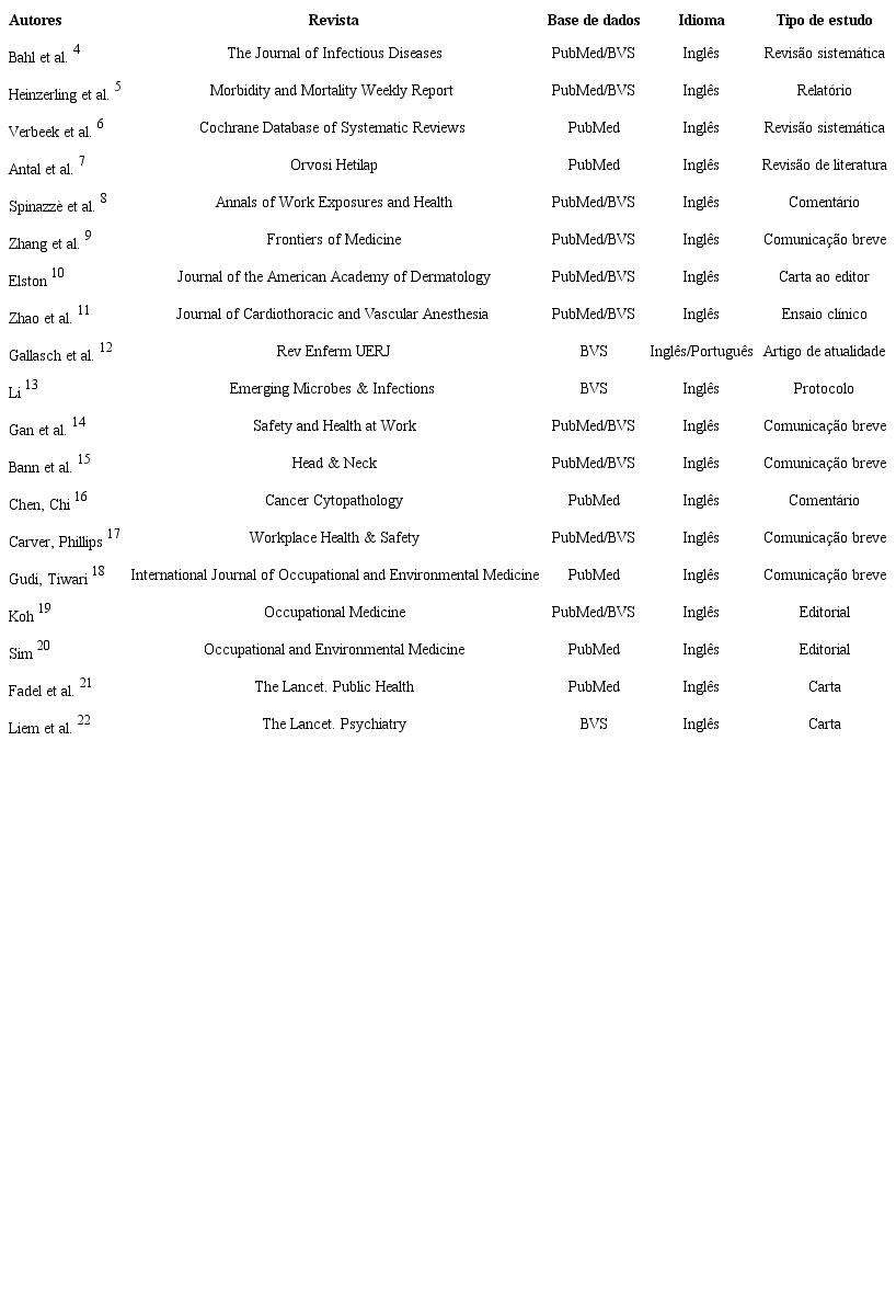 Foram selecionados textos publicados no período entre janeiro e abril de 2020, nos idiomas inglês, português e espanhol. Não foram incluídas publicações que abordavam doenças provocadas por outras cepas de coronavírus, que não se referiam à saúde dos trabalhadores ou duplicadas. Convém esclarecer que as publicações foram selecionadas independentemente do tipo de estudo, incluindo comunicações breves, editoriais, cartas e congêneres, dado o caráter recente dessa linha investigativa e a necessidade de abranger o máximo de conhecimento já produzido.