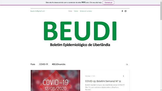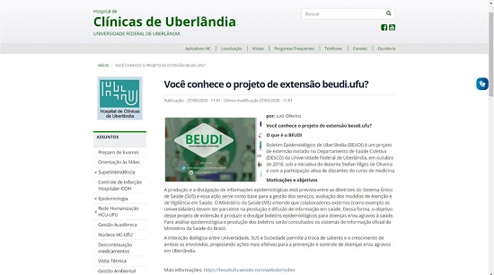 Uma vez elaborado, o boletim é divulgado de forma a atingir a população como um todo ( Figura 1). Com esse objetivo, criou-se um site para o projeto (https://beudiufu.wixsite.com/website) ( Figura 2), com possibilidade de assinatura gratuita para recebimento via e-mail de notificação de postagem de materiais, bem como redes sociais e uma aba no site do Hospital de Clínicas da Universidade Federal de Uberlândia ( Figura 3). Por fim, a divulgação é feita diretamente para acadêmicos e profissionais da saúde através de aplicativos de troca de mensagens e redes sociais. Ao total, foram produzidos 11 boletins até 14 de junho de 2020, com mais de 1.000 visualizações no site e 225 seguidores no Instagram.