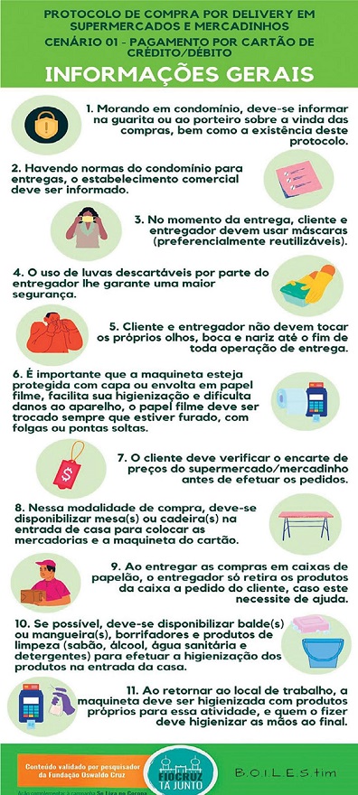 Para o processo de produção desses materiais foi necessário realizar um grande apanhado de informações sobre as práticas atuais de compras, sobre o funcionamento de compras em formato delivery e sobre práticas recomendadas pelos pesquisadores, sobretudo da saúde e áreas afins, acerca da devida higienização durante e após as compras. Na busca por validação de pesquisadores especialistas, conseguiu-se selo de validação junto à renomada Fundação Oswaldo Cruz, por meio de ação complementar à campanha “Se Liga no Corona” 17 .