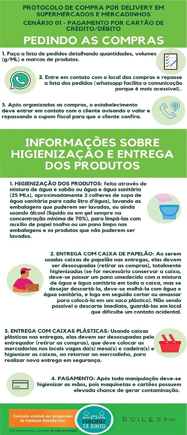 Objetivo: Expor o processo de formulação de protocolos escritos e encartes gráficos educativos, no sentido de diminuir a transmissão viral do SARS-CoV-2 por meio de compras na modalidade delivery .