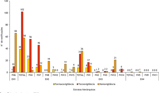 Apesar de somente um responsável ter referido que a FH realizava atividades formais de farmacovigilância, as práticas relacionadas eram apoiadas pelo serviço de farmácia em 11 dos 15 hospitais (73,3%). Foram realizadas 313 notificações à Agência Nacional de Vigilância Sanitária (Anvisa) através do NSP, sendo 48 (15,3%) de farmacovigilância, 129 (41,2%) de tecnovigilância e 136 (43,5%) de hemovigilância. O total de notificações de farmacovigilância por EH foi de uma para o EH1 (1,3% do total de 77 notificações), 39 para o EH2 (19,6% do total de 199 notificações), oito para o EH3 (10,7% de 75 notificações) e zero para o EH4, que apresentou somente uma notificação (de hemovigilância). A distribuição das notificações por tipo, FH e EH está apresentada na Figura 1.
