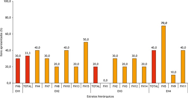 Por fim, na etapa 3, foi calculado o percentual de apresentação dos itens previstos na etapa 2 em comparação ao dito ideal (apresentação de todos os itens), que possibilitou a classificação das FH quanto ao apoio às atividades de gestão de risco em regular, médio e bom cumprimento (0,0%–33,3%, 33,4%–66,5% e 66,6%–100% do ideal, respectivamente; variável desfecho) 20.