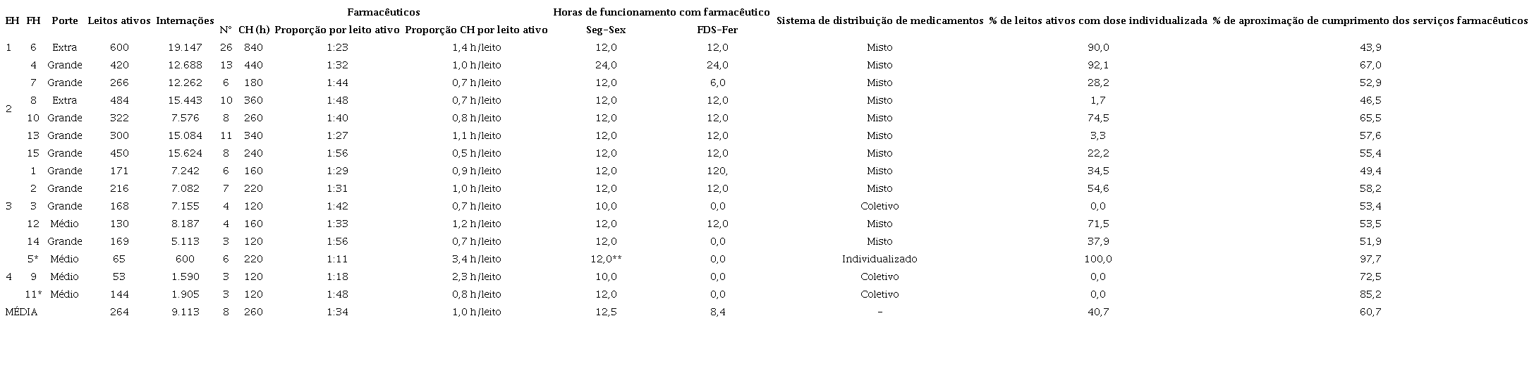 Todos os hospitais apresentam sistema informatizado para viabilizar a prescrição de medicamentos e o sistema de distribuição desses medicamentos mais frequente foi o misto: 11 das 15 FH (73,3%). Somente um hospital apresentou sistema de distribuição individualizado para todos os leitos ativos (FH5) e a proporção de leitos com dose individualizada nos hospitais com sistema de distribuição misto variou entre os EH ( Tabela 1). Dos 3.958 leitos ativos, considerando todas as FH com sistema de distribuição individualizado ou misto, 1.759 (40,7%) eram atendidos pelo sistema de distribuição individualizado (ou seja, distribuição dos medicamentos por paciente, de acordo com a prescrição médica, geralmente para um período de 24 h de tratamento; os demais leitos eram atendidos pelo sistema coletivo de distribuição de medicamentos, isto é, medicamentos distribuídos por unidade de internação ou serviço, conforme requisição para todos os pacientes da unidade assistencial) ( Tabela 1). O percentual médio de aproximação global dos serviços farmacêuticos considerando as 15 FH foi de 60,7 ( Tabela 1).