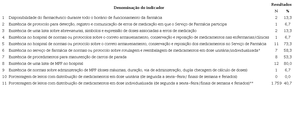 Results: The average proportion of items presented in risk management indicators was 28.3%. Less than half of the active beds had an individualized dose as drug delivery system. There were 48 reports of pharmacovigilance in the period. The parameters that influenced the outcome variable were: staff training schedule, HP hours with pharmacist, active beds with individualized dose, and percentage of compliance with pharmaceutical services (p < 0.05).