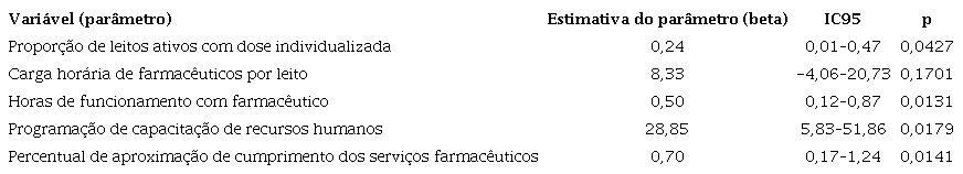 As outras variáveis que potencialmente explicariam a variável desfecho com significância estatística foram a proporção de horas de funcionamento da FH com farmacêutico, a proporção de leitos ativos com dose individualizada e o percentual global de aproximação de cumprimento dos serviços farmacêuticos (p = 0,0131, p = 0,0427 e p = 0,0141, respectivamente). Entretanto, a magnitude de influência dessas variáveis foi baixa: o aumento proporcional de 1% em relação a essas variáveis remeteu ao aumento de 0,50%, 0,24% e 0,70% do percentual de aproximação de cumprimento dos serviços relacionados à variável desfecho ( Tabela 3).