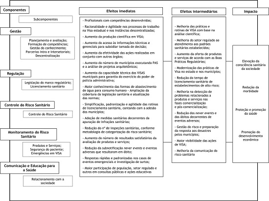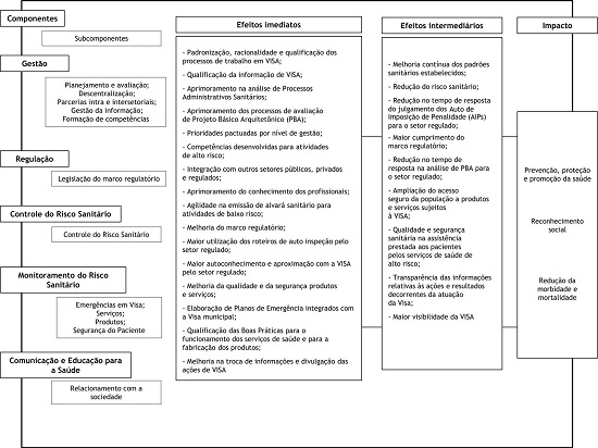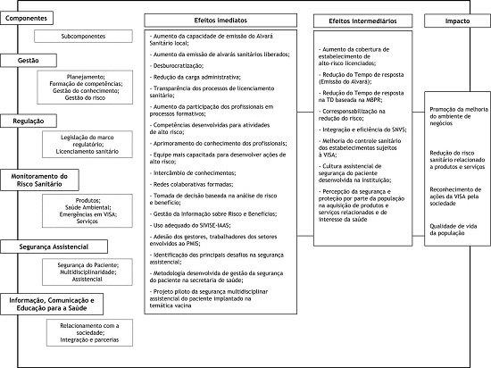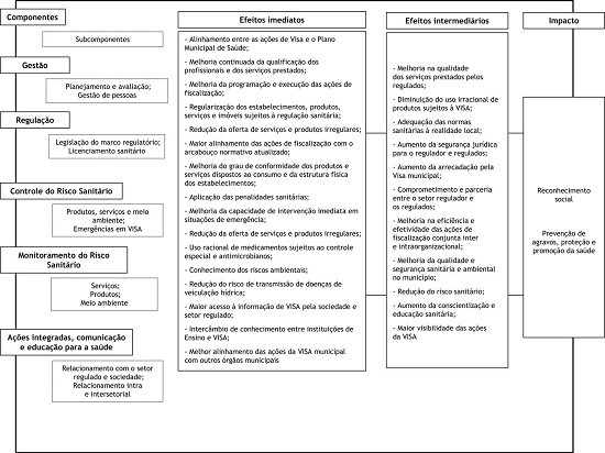 Os modelos lógicos delineados nas Figuras 1 , 2 , 3 e 4 apresentam a relação causal entre as práticas de vigilância sanitária e seus efeitos imediatos (relacionados mais diretamente aos componentes, subcomponentes e suas atividades correlatas), os efeitos intermediários (se bem-sucedidos, irão atingir a população-alvo da intervenção) e o impacto, que atinge a população em geral como consequência da realização dos efeitos intermediários, sendo muitas vezes influenciados por fatores externos e/ou pertencentes a outras intervenções.