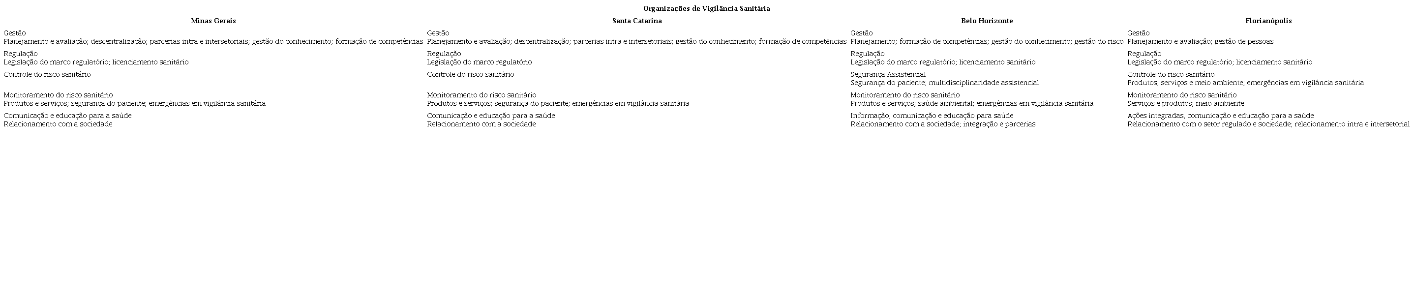 O delineamento dos modelos lógicos das organizações de Visa de Santa Catarina e Minas Gerais foi mediado pelo nível de análise estadual, representado pelas ações de planejamento e descentralização, cooperação técnica, cofinanciamento, além da execução das ações de forma direta e/ou complementar. Por conseguinte, nas instâncias de Visa de Belo Horizonte e de Florianópolis tomou-se como parâmetro o nível de análise municipal, representado pelas competências de planejamento, gestão, controle, avaliação e execução das ações de vigilância sanitária nos municípios.