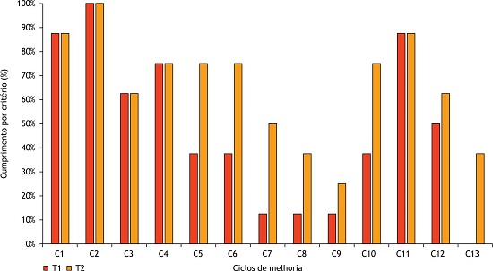 A realização do ciclo de melhoria contribuiu com uma redução dos problemas de qualidade encontrados na avaliação inicial, colaborando para uma melhoria em torno de 40,0% ou mais em metade das instituições participantes. Foi possível observar que os critérios com maior dificuldade de cumprimento no T1 foram os que tiveram o aumento mais perceptível de cumprimento no T2, demonstrando a importância da realização do ciclo de melhoria, ou seja, a metodologia empregada foi efetiva.