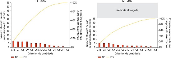 O nível de cumprimento de cada critério foi avaliado com base em frequências relativas e absolutas. A partir dos dados obtidos foram elaborados gráficos de Pareto, sendo uma ferramenta amplamente utilizada na avaliação da qualidade, pois evidencia as principais inconformidades com os critérios utilizados, além da melhoria obtida entre as duas avaliações (T1 e T2). No gráfico de Pareto, o eixo das abcissas corresponde aos critérios de qualidade avaliados ordenados dos mais aos menos frequentes. O eixo das ordenadas da esquerda contém o número absoluto e o da direita, a frequência relativa, de não cumprimento dos critérios.