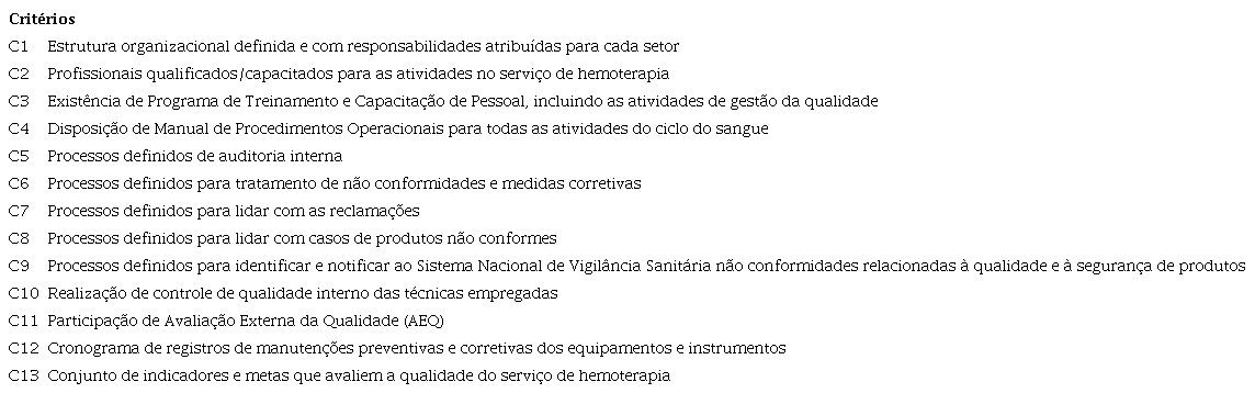 A equipe da SUVISA/RN responsável pela inspeção nos serviços de hemoterapia do interior do RN desenvolveu 13 critérios de qualidade baseados no MARPSH. Os critérios encontram-se descritos no Quadro .