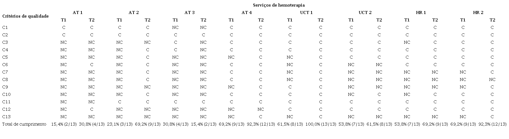 No tocante à análise por critérios, de forma geral, foi mantido ou aumentado o nível de cumprimento, com melhoria na implementação de processos de auditoria interna (C5), de protocolos (C6 - C10), manutenção dos equipamentos (C12) e implementação de indicadores de qualidade (C13) como descrito na Figura 1 . Todavia, a implementação de protocolos (C7 - C9), assim como a implementação de indicadores (C13), permaneceram com o menor percentual de cumprimento dentre os demais critérios.