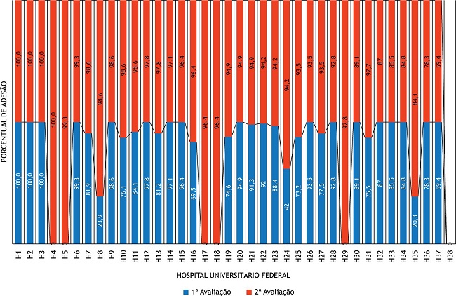 Todos os hospitais do estudo mantiveram ou aumentaram seus percentuais de adesão na segunda avaliação, em comparação com a primeira.