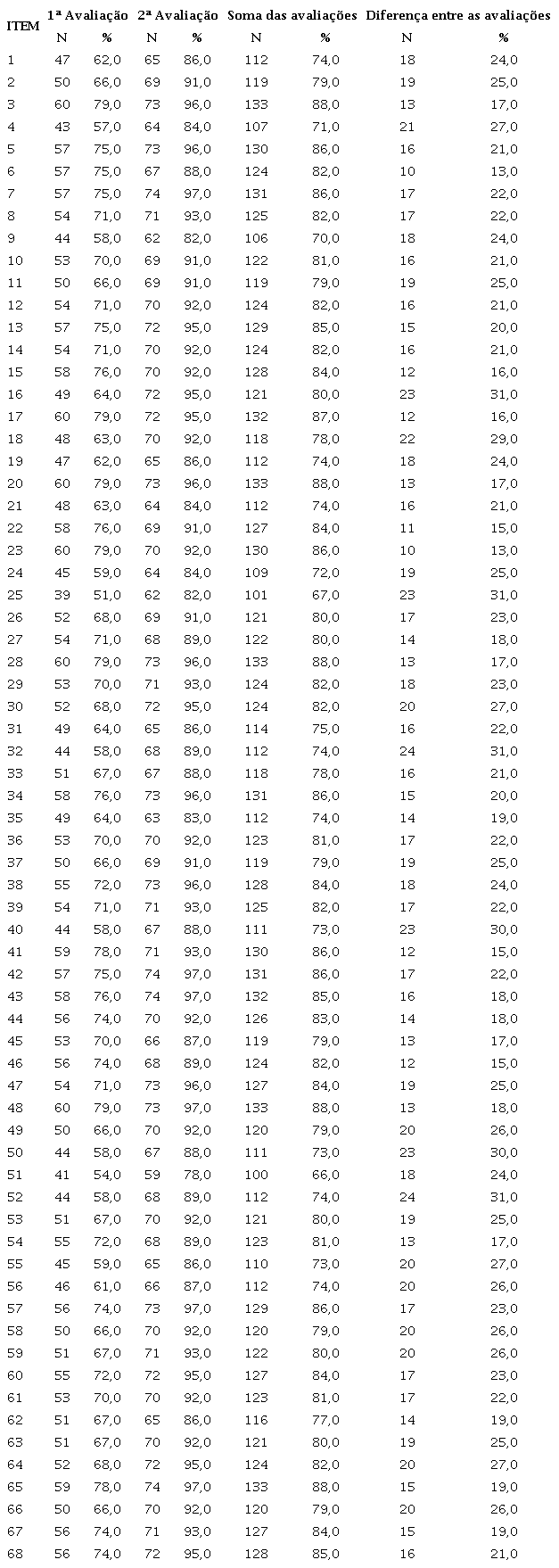 Ainda confrontando os resultados das duas avaliações, os itens com menores diferenças foram: atividades eletivas suspensas e estimativa de abertura de leitos, com 13,0% de aumento nos dois resultados. Vale ressaltar que os 68 itens apresentaram maior percentual de adesão na segunda avaliação, em relação à primeira.