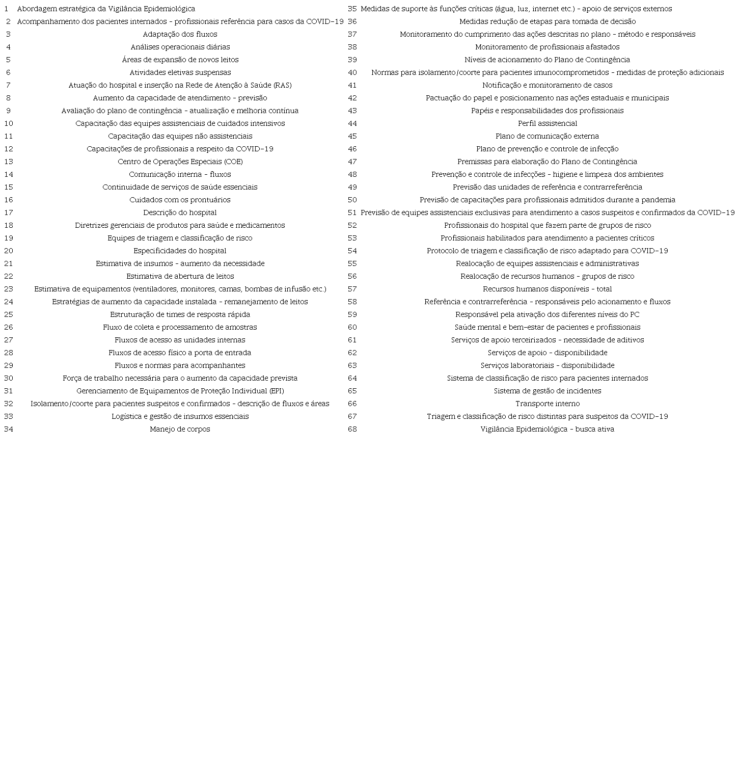 Conclusions: The research demonstrated the potential of the model to guide institutions in preparing their plans. Considering the positive results of this experience and the historical scarcity of hospital beds, especially those with ventilatory support, it is recommended that Brazilian health authorities can invest time and resources in the preparation of guiding documents that assist managers in reorganizing hospitals and response in crisis situations.