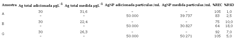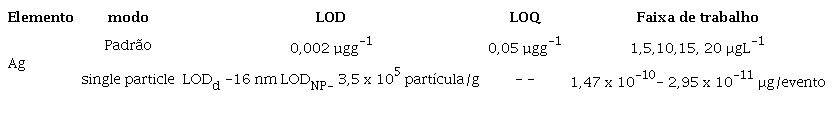 Os resultados obtidos na validação da metodologia para determinação de Ag e AgNP no modo padrão e no modo single particle estão apresentados na Tabela 1 .