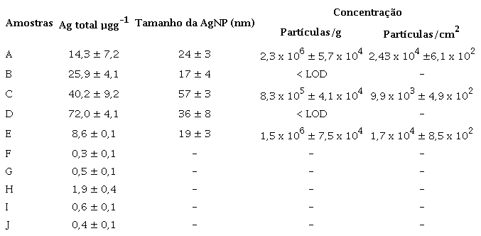 Ao comparar os resultados das amostras analisadas, observa-se que foi possível quantificar Ag em todas as amostras, mesmo nas amostras que não declararam ter Ag na sua composição. A variação observada foi na concentração, pois nas amostras que não declararam ter Ag, a concentração foi menor que 2 µgg-1, enquanto as amostras que declararam ter Ag na sua composição o valor encontrado foi no mínimo sete vezes maior, com exceção da amostra F, que declarou ação antimicrobiana, e a concentração da Ag estava próxima à das amostras que declararam não ter essa ação, entretanto essa ação pode ser causada por outras substâncias não avaliadas nesse estudo.