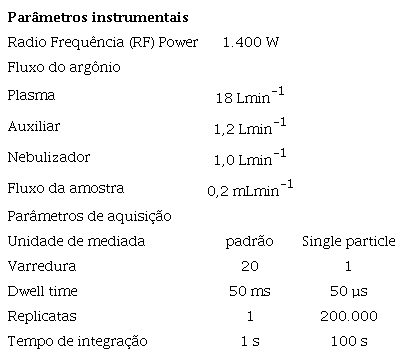 Os experimentos foram realizados em um espectrômetro de massas com plasma indutivamente acoplado operado no modo padrão e no modo single particle (sp-ICP-MS), modelo NexION 300D (Perkin Elmer, EUA). O espectrômetro de massa com plasma indutivamente acoplado (ICP-MS) estava equipado com um nebulizador concêntrico (Meinhard), câmara de nebulização ciclônica de vidro, cone, skimmer e hiper-skimmer de níquel. Gás argônio com pureza mínima de 99,996% foi fornecido pela White Martins (São Paulo, Brasil). Os parâmetros instrumentais e de aquisição de dados estão listados no Quadro 1 .