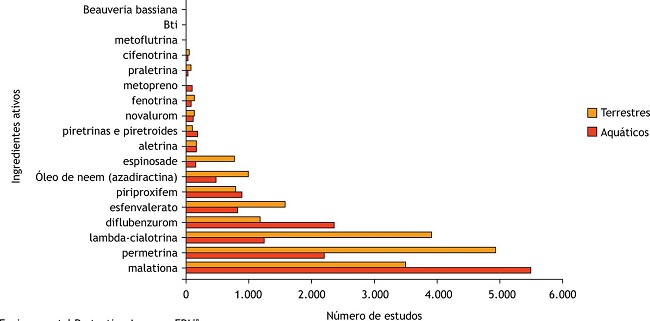 Os riscos ambientais apresentados por alguns dos ingredientes ativos enfatizam a necessidade de mais avaliações ecotoxicológicas, principalmente para os ingredientes ativos que não apresentam quaisquer estudos na base de dados pesquisada, como, por exemplo, o Bti. Este larvicida apresenta inclusive posicionamentos sobre segurança ambiental divergentes na literatura. Metopreno e novalurom também chamaram atenção pelo baixo número de estudos, 114 (0,30%) e 244 (0,70%), respectivamente ( Figura 1 ), apesar de já terem sido associados a riscos para alguns organismos não alvo.