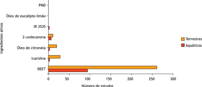 O número de estudos toxicológicos para repelentes tópicos é significativamente menor ( Figura 2 ), com no máximo 357 por ingrediente ativo, nesse caso o DEET. Foi encontrado um total de 438 estudos para sete compostos utilizados como repelentes tópicos, considerando investigações em organismos não alvo terrestres e aquáticos18 .