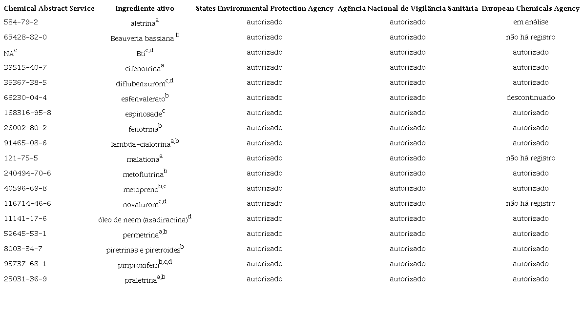 Como larvicidas, são utilizados Bti, diflubenzurom, espinosade, metopreno, novalurom e piriproxifem além de filmes e óleos colocados na superfície da água, capazes de evitar trocas gasosas entre atmosfera e o ambiente aquático37 . Contudo, no NPRO foram encontrados apenas os ativos Bti, metopreno e piriproxifem com indicação específica para controle de Ae. aegypti45 , apesar de todos os demais ingredientes citados pelo CDC46 serem registrados na agência americana45 .
