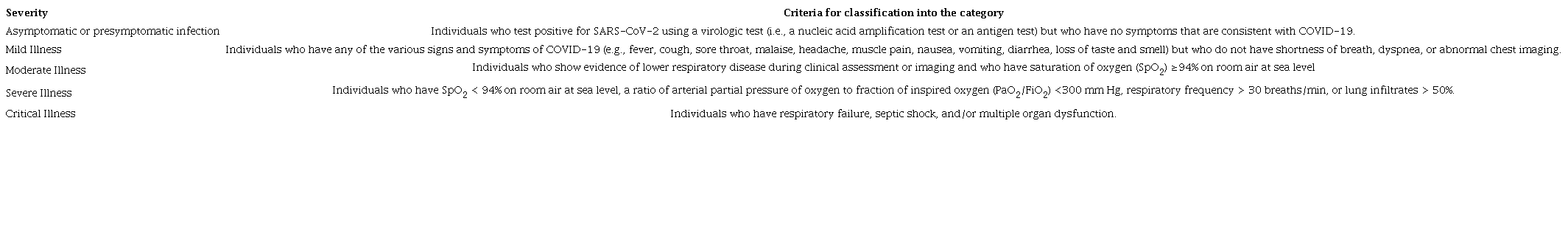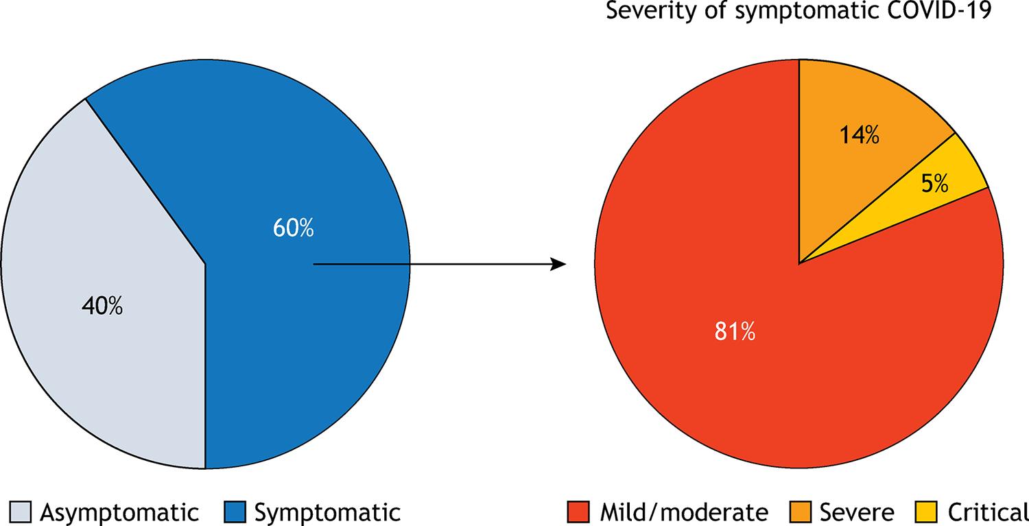 According to US NIH’s and CDC’s classification of illness severity of patients with COVID-19 ( Table 1 ), the spectrum of disease severity ranges from asymptomatic and mild cases to severe and critical illness10. The exact proportion of asymptomatic COVID-19 is uncertain. Based on data from three large cohorts that identified cases by population-based testing, it was estimated that infections may progress asymptomatically in 33 to 40% of all people infected with SARS-CoV-2 ( Figure )11 , 12.