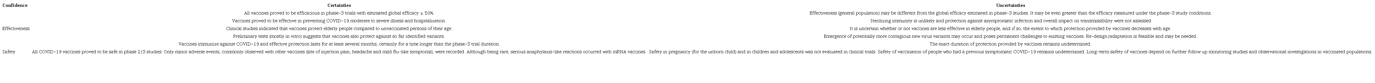 Results: COVID-19 vaccines proved to be efficacious and safe in clinical trials. Adverse events were mostly those of minor severity commonly noted with other vaccines such as injection site pain, mild flu-like symptoms, headache and asthenia. Although being very rare, anaphylaxis-like reactions were noted with mRNA vaccines. Uncertainties regarding vaccine effectiveness refer mainly to the (long-term) duration of immunity provided by vaccination, the degree of protection conferred to elderly people, and how effective vaccines are against emerging SARS-CoV-2 variants. There are few uncertainties about vaccine safety including the absence of clinical trial data in pregnant women (and the impact on the unborn child), children and adolescents.