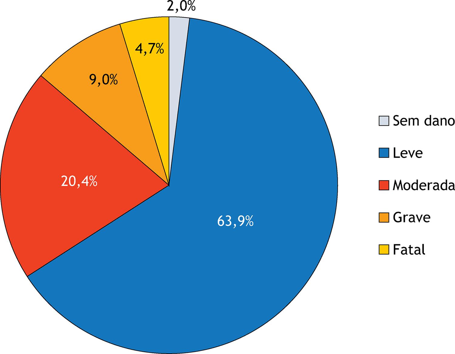Quanto à gravidade das RAM, os incidentes foram, em sua grande parte, classificados como leves (n = 163, 63,9%), ou seja, reações de pequena importância clínica e de curta duração, que não afetaram substancialmente a vida do paciente. Observou-se ainda o aparecimento de 52 (20,4%) casos de gravidade moderada – que podem ter causado ou prolongado a internação hospitalar, necessitando do uso de antídotos, 23 (9,0%) graves – ameaçando diretamente a vida do paciente, podendo deixar sequelas permanentes – e 12 (4,7%) fatais, resultando em óbitos13 ( Figura ).