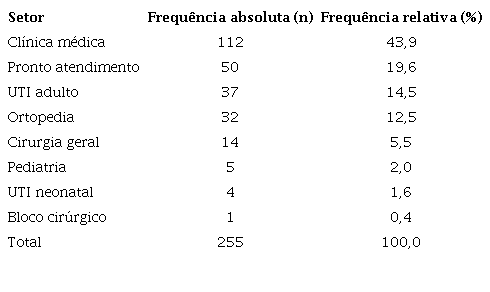 As notificações foram realizadas por todos os setores assistenciais do hospital, de acordo com a Tabela 1 . A unidade de internação que mais registrou casos de RAM foi a clínica médica (43,9%), seguida do pronto atendimento (19,6%) e da unidade de terapia intensiva (UTI) adulto (14,5%). Demais pesquisadores apontaram a clínica médica como o principal setor acometido pelas RAM em trabalhos semelhantes ao presente estudo30 , 18. A maior frequência de notificações nessa unidade de internação pode ser explicada pelas características dos usuários do setor, como um maior número de doenças crônicas e polimedicação31.