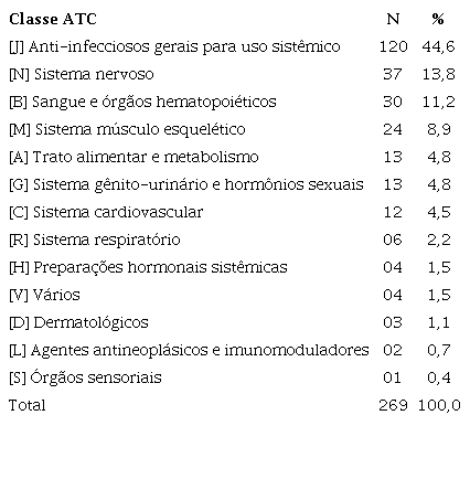 As 255 notificações de RAM envolveram 269 medicamentos, correspondendo a 97 princípios ativos diferentes. Torna-se válido ressaltar que em alguns casos de RAM houve a suspeita de mais de um medicamento, evidenciando a dificuldade em detectar com precisão qual deles desencadeou a reação adversa. Esses medicamentos, segundo a classificação do primeiro nível do código ATC, pertencem principalmente à classe de anti-infecciosos gerais para uso sistêmico (44,6%). Cerca de 13,8% dos episódios foram associados aos medicamentos que atuam no sistema nervoso e 11,2% com os fármacos que agem no sangue e nos órgãos hematopoiéticos ( Tabela 3 ). Em 2011, Romeu et al.15 também relataram tais classes como as principais responsáveis pelas RAM ocorridas num hospital sentinela de Fortaleza.