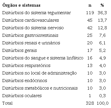 No que tange as manifestações clínicas das RAM observadas no estudo, constatou-se que o sistema tegumentar foi o mais afetado, sendo responsável por 36,3% (n = 119) dos sintomas, destacando-se o prurido (42,0%, n = 50), o rash cutâneo (21,0%, n = 25) e o eritema (16,0%, n = 19). Por conseguinte, reportaram-se os distúrbios cardiovasculares (hiperemia, taquicardia e tromboembolismo), representando 13,7% (n = 45) das RAM, seguidos das alterações no sistema nervoso central e periférico (isquemias/hemorragias cerebrais, tremores e agitação), totalizando 12,8% (n = 42) dos eventos ( Tabela 4 ). Em vários casos, um único paciente apresentou mais de uma reação, o que acarretou um total de 328 episódios de RAM no período estudado, nos quais os anti-infecciosos tiveram contribuição majoritária.