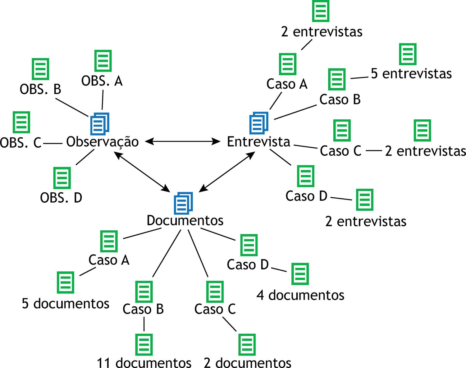 A fim de se preservar o anonimato dos participantes, os casos são denominados A, B, C e D. Os gerentes de risco e os demais profissionais que atuam na vigilância sanitária pós-comercialização são identificados pela letra que determina o caso, seguida de um número de 1 a 5 que representa o profissional. Os documentos estão identificados pela sigla DOC., seguida de um número que representa o documento e da letra que identifica o caso. As observações estão identificadas pela sigla OBS., seguida da letra que identifica o caso. A Figura ilustra o conjunto dos dados coletados.