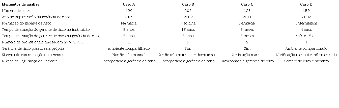 Todos os casos estudados são hospitais de referência estaduais e são credenciados no perfil participante na Rede Sentinela. As instituições possuem gerente de risco, contudo, sem dedicação exclusiva para as atividades do setor. Todos os casos realizavam notificações nas áreas de tecnovigilância, hemovigilância, farmacovigilância e erros de assistência, mas apenas o caso B realizava notificações na área de biovigilância. As características de cada caso estão descritas no Quadro 1 .