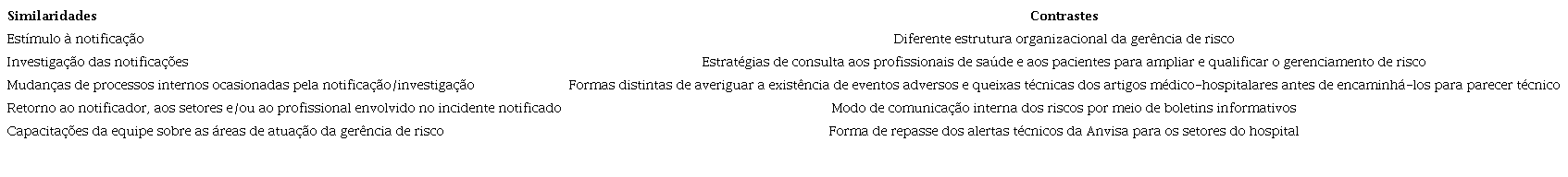 Resultados: Entre as similaridades nas ações realizadas pela gerência de risco hospitalar estavam o estímulo à notificação, a investigação das notificações, o feedback sobre a notificação e a capacitação dos profissionais sobre a temática. Entre os principais contrastes encontrou-se a estrutura organizacional da gerência de risco em cada instituição e o processo de comunicação interna dos riscos.