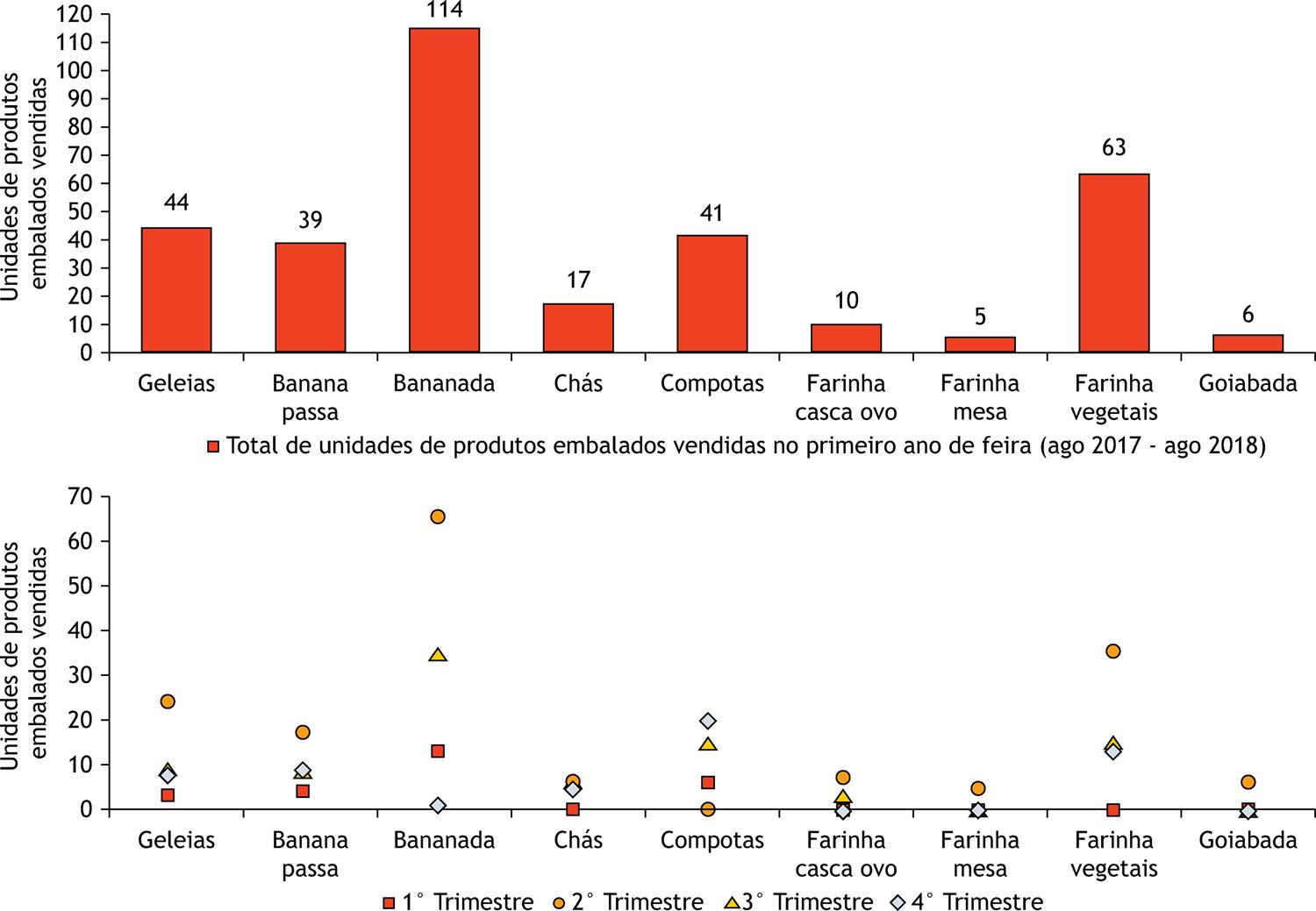 Observa-se que a bananada foi o produto que mais se destacou no total de vendas durante o período avaliado, somando 114 unidades vendidas. As farinhas de origem vegetal representaram o segundo item com maior expressão de vendas (63 unidades). Foi observado que a frequência de comercialização dessas farinhas mudou ao longo do período avaliado devido à sazonalidade dos vegetais e, por esse motivo, foram identificadas as farinhas presentes na maior parte do ano investigado, a saber: farinhas de quiabo, banana verde e berinjela.