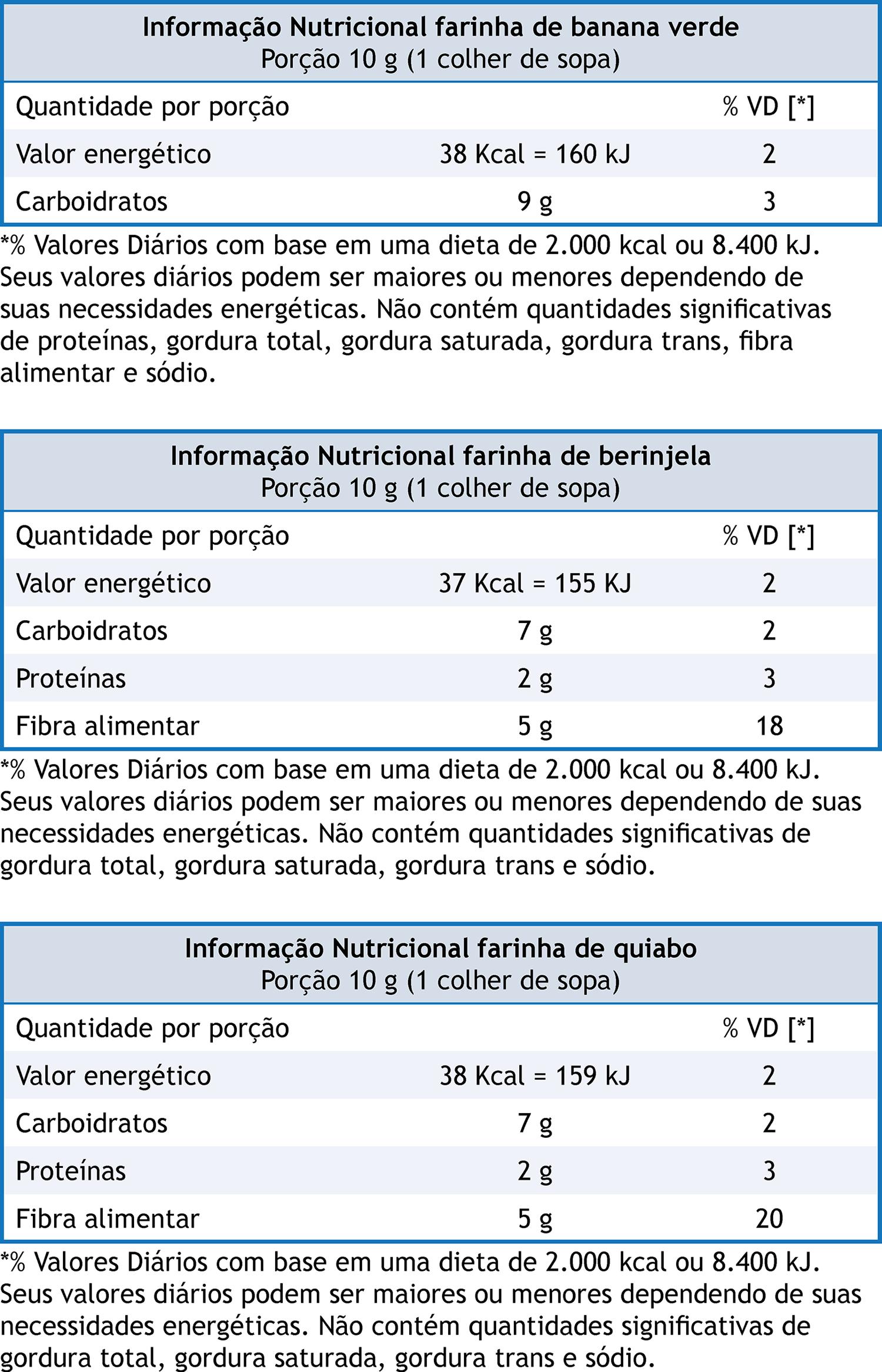Como forma de contribuir para sanar as incorreções observadas no presente estudo, foram elaborados os rótulos nutricionais das farinhas vegetais investigadas ( Figura 2 ). As porções sugeridas (10 g) das farinhas de berinjela e quiabo, avaliadas no presente estudo, forneceram 5 g de fibra, o que permite que sejam classificadas como alimentos com alto conteúdo em fibras, de acordo com o estabelecido pela RDC nº 54, de 12 de novembro de 201224. Devido à versatilidade na forma de consumo, as farinhas de vegetais podem ser adicionadas com o objetivo de aumentar o valor nutricional e bioativo de diferentes tipos de preparações em função do seu conteúdo de fibras solúveis e insolúveis, sais minerais e compostos antioxidantes, em especial compostos fenólicos25 , 26 , 27 , 28 , 29 , 30 , 31.