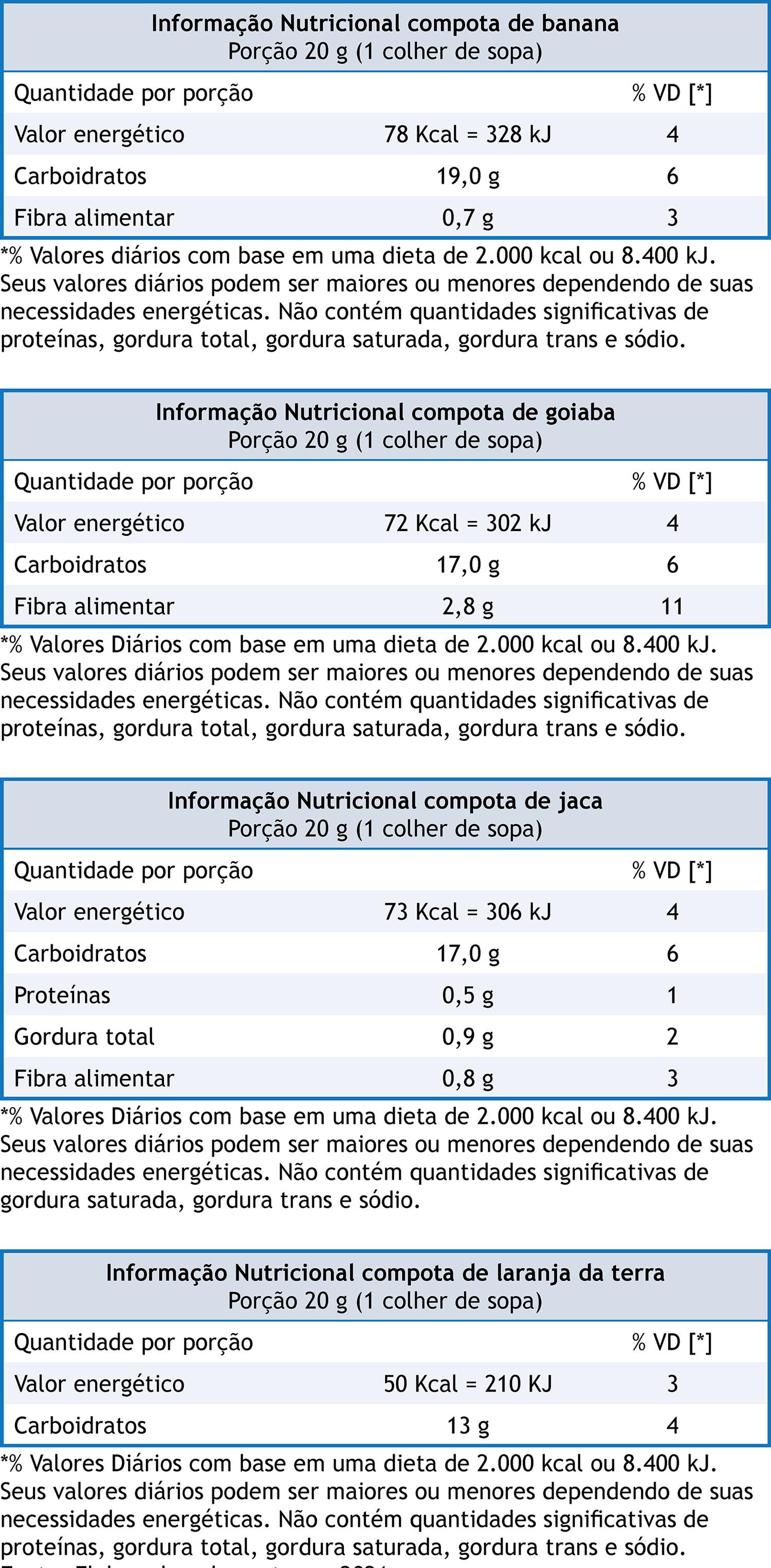 Os rótulos das compotas de fruta também foram elaborados ( Figura 3 ). Além de serem doces popularmente consumidos, são ainda uma forma de evitar perda/desperdício das frutas da safra. A sua elaboração ocorre através do emprego de técnicas simples, que consistem na separação das frutas, na adição de açúcar, em uma proporção que varia de 30% a 60% do peso da fruta, e na aplicação de um tratamento térmico até que se alcance a consistência desejada32. As compotas devem ser consumidas moderadamente, pois mais da metade da sua porção é composta por açúcar de adição, cujo consumo excessivo pode favorecer o desenvolvimento de agravos à saúde, como a obesidade e suas comorbidades33. Nesse sentido, o conhecimento do rótulo nutricional torna-se relevante não só para a elaboração de um planejamento alimentar adequado e saudável, como também para permitir que os consumidores exerçam seus direitos no que diz respeito ao acesso à informação correta, em especial às características nutricionais do produto que está adquirindo e consumindo.