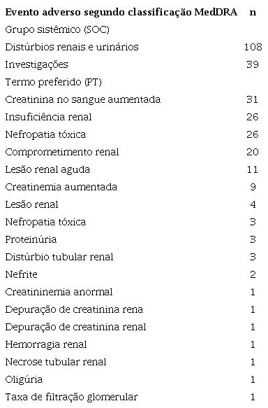As notificações encontradas associadas à nefrotoxicidade, quando classificadas segundo o MedDRA, apresentaram em sua maioria, no primeiro nível, SOC, distúrbios renais e urinários, com 108 casos. Segundo o PT, as notificações mais frequentes foram creatinina no sangue aumentada, com 31 casos, e insuficiência renal e nefropatia tóxica, com 26 casos ( Tabela 1).