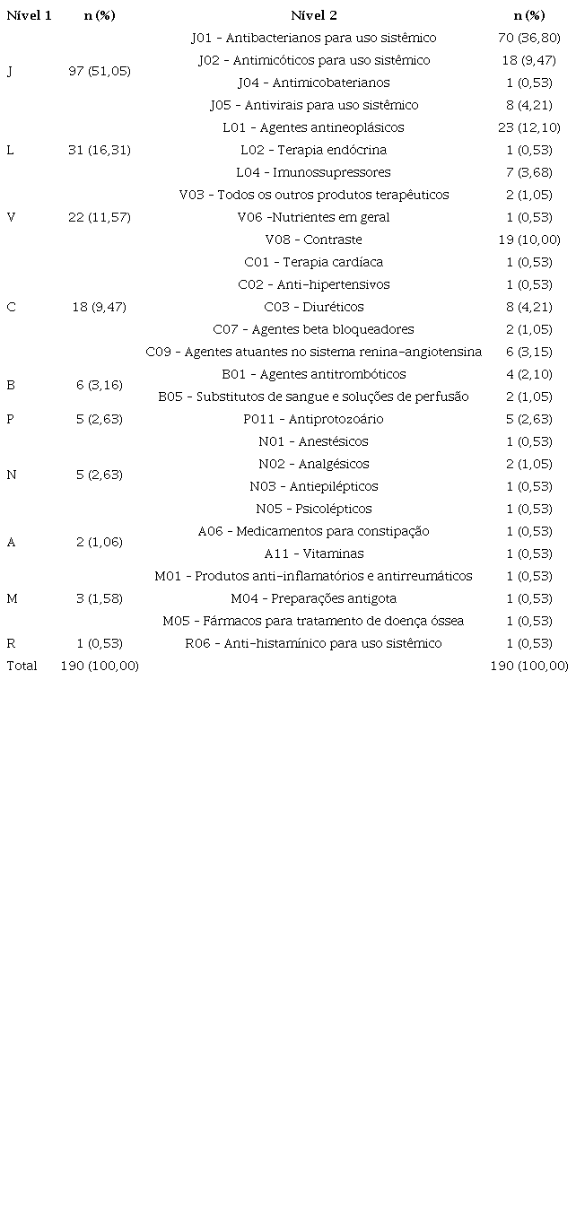 Os medicamentos que agem como anti-infecciosos sistêmicos (grupo J) foram relatados 97 vezes (51,05%), principalmente os antibacterianos de uso sistêmico (J01), 70 vezes (36,80%) e os antimicóticos para uso sistêmico (J02), 18 vezes (9,97%). Somado a esses, é destacada a notificação de agentes antineoplásicos e imunomoduladores (grupo L), 30 vezes (16,31%), nesse grupo, principalmente os agentes antineoplásicos (L01), 23 vezes (12,10%). Outro grupo terapêutico frequente foi o presente no grupo “vários” contraste (V08) presente 19 vezes (10,00%) ( Tabela 2).