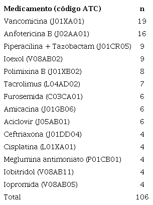 Results: 146 notifications reporting nephrotoxicity, with 79 different drugs reported. There was a prevalence of systemic anti-infective agents (group J), 97 (51.05%), mainly antibacterials for systemic use (J01), 70 (36.80%) and antimycotics for systemic use (J02), 18 (9.97%). They were followed by antineoplastic agents and immunomodulators (group L), 30 (16.31%), mainly antineoplastic agents (L01), 23 (12.10%), and the group Various, with contrast (V08), 19 (10.00%). The most frequent medications were Vancomycin, 19, followed by Amphotericin B, 16, and Piperacillin + Tazobactam and Ioexol.