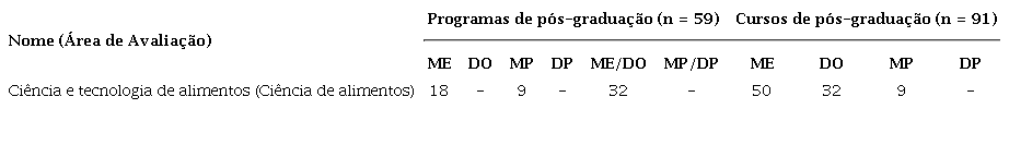 Durante a revisão de documentos (normas, guias, códigos de práticas, entre outros), o Codex Alimentarius leva em conta dados levantados pelos países, além de publicações da literatura científica referentes ao tema de discussão em questão. Esses dados da literatura científica podem ter diferentes origens, como instituições de pesquisa, desenvolvimento e ensino (universidades, escolas de formação técnica, fundações), empresas públicas e privadas, institutos, entre outros. Neste contexto, os Programas de Pós-graduação que abrangem em seu escopo o controle da qualidade de alimentos possuem destaque, uma vez que produzem trabalhos de conclusão de curso, dissertações, teses, artigos científicos, produtos tecnológicos (por exemplo: manuais, procedimentos operacionais padronizados, cartilhas e relatórios), que podem ser consultados e utilizados nestas análises. De acordo com os dados da Plataforma Sucupira, na área de Ciência e Tecnologia de Alimentos, existem 59 Programas de Pós-graduação com diferentes modalidades de cursos de mestrado e doutorado (Tabela).