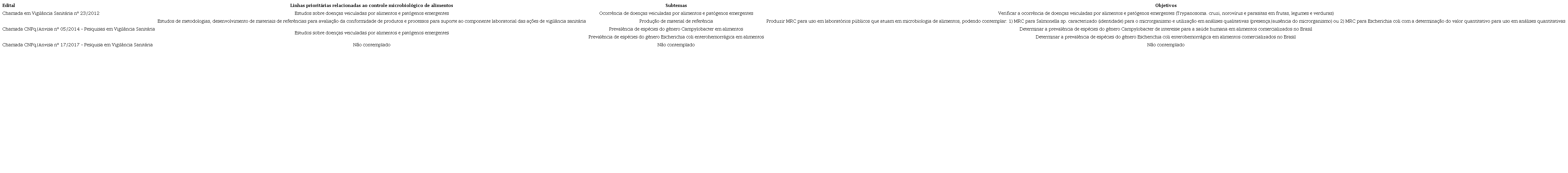 Para o desenvolvimento da pesquisa em vigilância sanitária, se faz necessário um investimento por parte do setor produtivo e dos organismos fiscalizadores17. Outra importante fonte de financiamento também ocorre por meio de órgãos de fomento nacionais e internacionais. Apesar dos Editais Universais serem lançados todos os anos pelo Conselho Nacional de Desenvolvimento Científico e Tecnológico (CNPq), apenas em 2012, em parceria com a Anvisa, o primeiro edital específico voltado à área de vigilância sanitária foi lançado. Posteriormente foram lançados mais dois editais e ações específicas relacionadas ao controle microbiológico de alimentos foram contempladas em 2012 e 2014, demonstrando a importância desta linha de pesquisa para o país (Quadro).