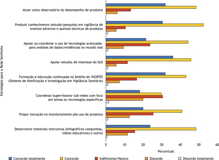 Somando-se as opiniões “concordo totalmente” e “concordo” dos respondentes, que superaram valores acima de 65%, os estabelecimentos de saúde da Rede Sentinela podem ser atuantes, principalmente, na vigilância de materiais médico-hospitalares (94,0%), sangue e hemocomponentes (92,3%), artigos médico-hospitalares (91,7%), medicamentos (89,5%), equipamentos médico-hospitalares (89,5%), saneantes (78,5%), implantes (69,0%) e intoxicação por produtos (67,4%) (Figura 3).