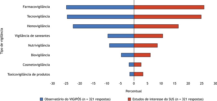 Farmacovigilância, tecnovigilância e hemovigilância foram as que mais se destacaram nas perguntas que tinham como respostas o posicionamento sobre os tipos de vigilância pós-comercialização/pós-uso. Nessas condições estavam a atuação geral do serviço na vigilância de produtos e como observatório, desenvolvimento ou apoio de estudos de interesse do SUS e contribuição imediata com a formação e educação continuada de profissionais da saúde. Dois motivos para o predomínio desses três tipos de vigilância são: i) a maior expertise da Rede Sentinela que desde a sua criação tem focado em ações voltadas à farmacovigilância, tecnovigilância e hemovigilância30; e ii) o produto de interesse de cada uma dessas vigilâncias (medicamentos, dispositivos médicos e sangue e seus componentes) são os mais comumente utilizados na atenção à saúde como respostas terapêuticas.