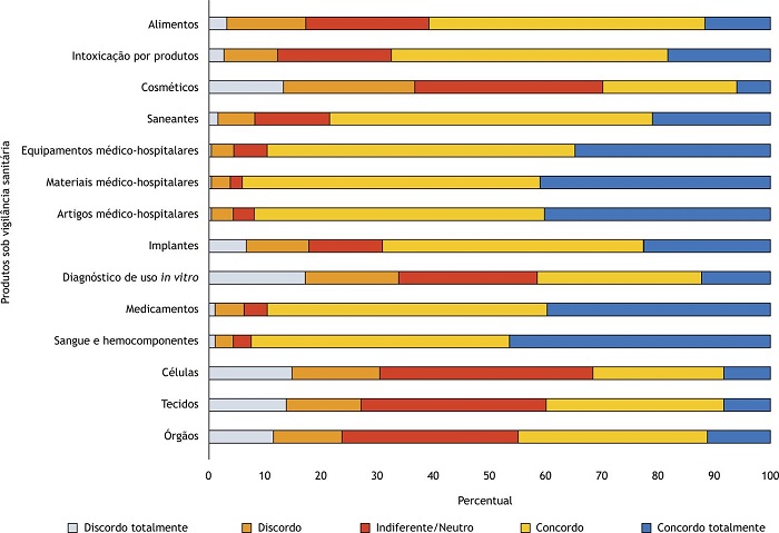 A vigilância dos cinco produtos com maiores percentuais de “discordo totalmente” e “discordo” referentes à atuação de estabelecimentos de saúde da Rede Sentinela envolveu, nesta ordem: cosméticos (36,5%), diagnóstico de uso in vitro (33,7%), células (30,4%), tecidos (27,1%) e órgãos (23,7%) (Figura 3).
