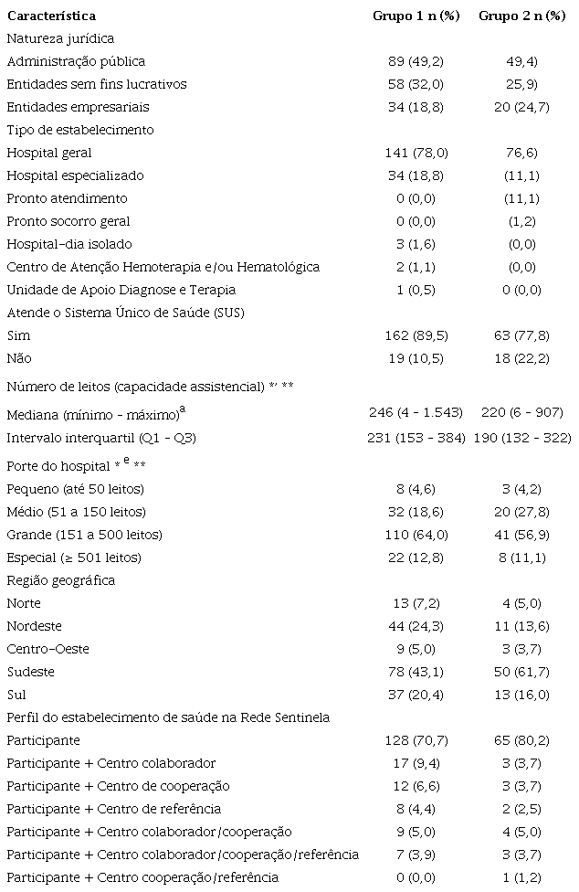 A Tabela 1 apresenta as características dos estabelecimentos de saúde da Rede Sentinela que responderam ao questionário (Grupo 1) frente aqueles que não encaminharam suas respostas (Grupo 2). No primeiro Grupo, dado o tipo de estabelecimento (Centro de Atenção Hemoterapia e/ou Hematológica e Unidade de Apoio Diagnose e Terapia), três questionários não foram incluídos nas análises relacionadas à quantificação do número de leitos. Para o Grupo 2, esse quantitativo foi de nove estabelecimentos de saúde (Pronto atendimento) (Tabela 1).