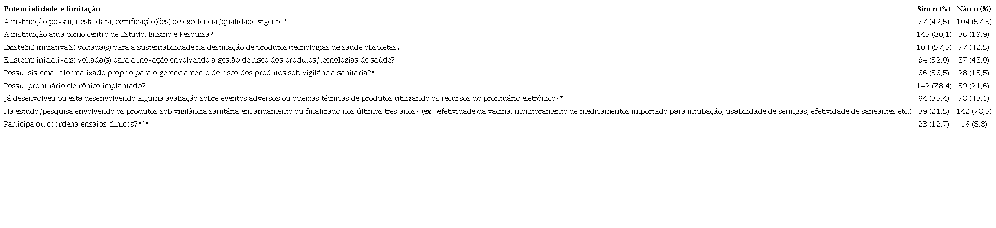 Results: A response rate of 69.1% (181/262) was obtained. Among the potentialities, the following stand out: acting as a center for study, teaching, and research of health establishments (n = 145; 80.1%), presence of implanted electronic medical records (n = 142; 78.4%) and the development of initiatives focused on innovation involving risk management of health products (n = 94; 52.0%). As one of the limitations, health establishments that do not have any current excellence/quality certifications predominate (n = 104; 57.5%).