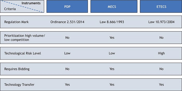 Aiming at consolidating the main differences between the contractual instruments, now under study, Figure 1 was elaborated. It is possible to analyze the relevance of the criteria selected, regulatory framework, prioritization of large volumes and little competition, level of technological risk, need for bidding, and TT at PDP, MECS and ETEC.